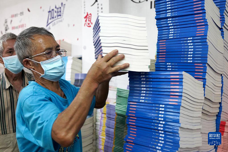 8月25日,在重慶市江北中學,工作人員在分揀課本。(新華社發(fā) 秦廷富/攝)