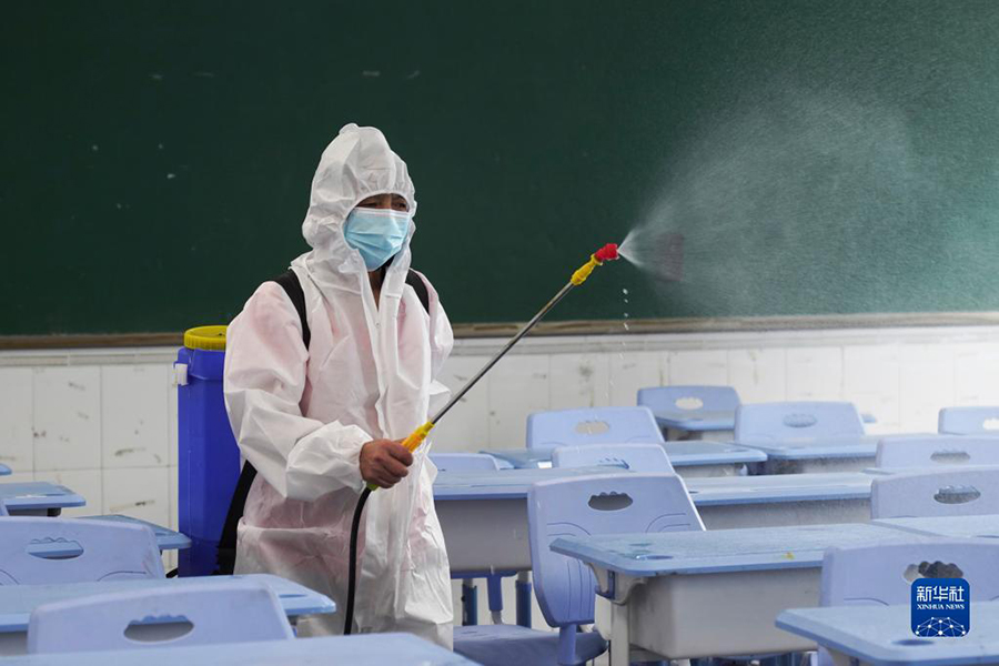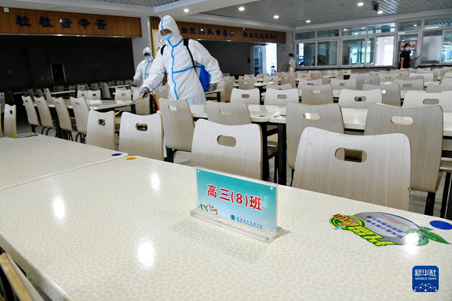 8月29日,青島通濟實驗學校校工在學生食堂內(nèi)消毒。(新華社記者 李紫恒/攝)