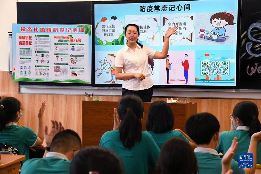 8月29日,青島通濟實驗學校九年級老師泮婷為學生上“開學第一課”,教育學生養(yǎng)成良好衛(wèi)生習慣。(新華社記者 李紫恒/攝)