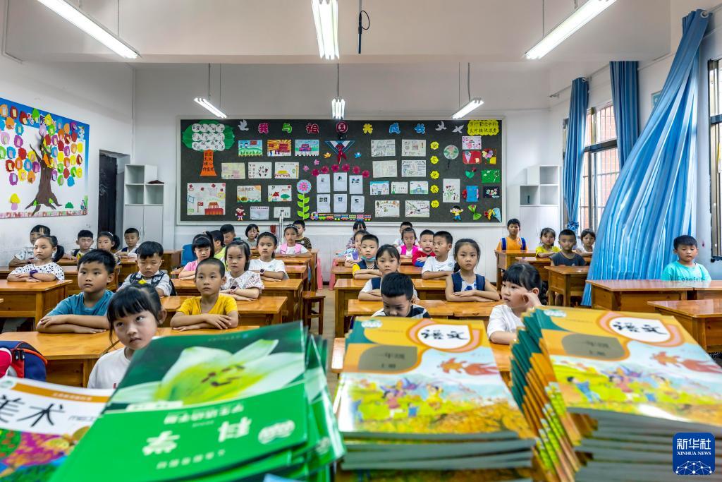 1/08月28日,黔西市第一小學學生在教室等待分發(fā)教材。(新華社發(fā) 范暉/攝)