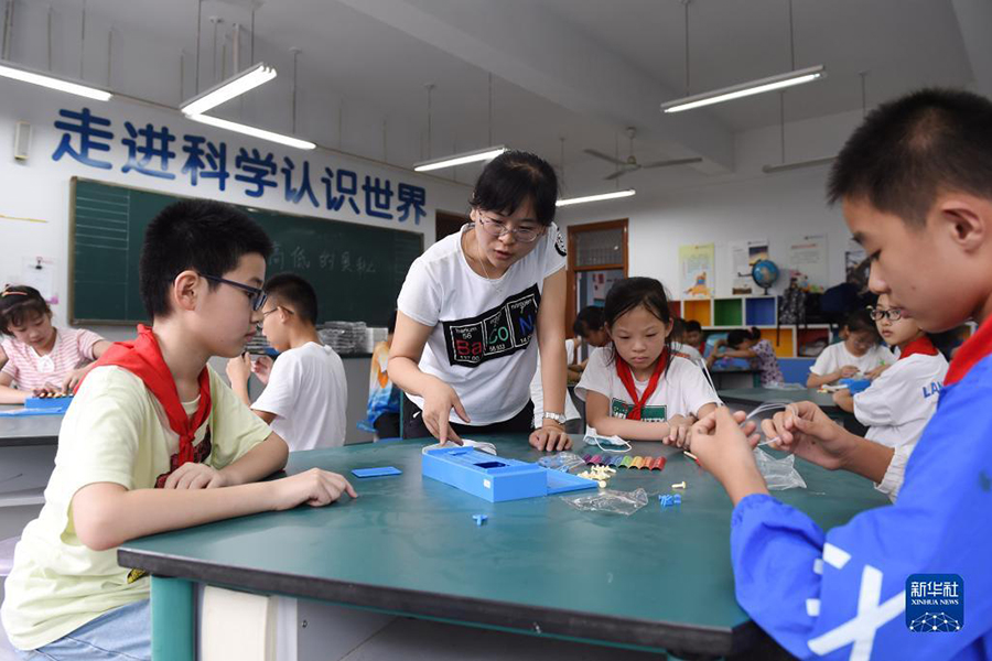1/09月2日,在合肥市師范附屬第三小學(xué),科學(xué)社團(tuán)的同學(xué)們在老師(中)指導(dǎo)下練習(xí)動手能力。(新華社記者 周牧/攝)