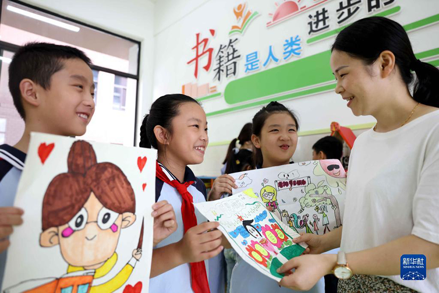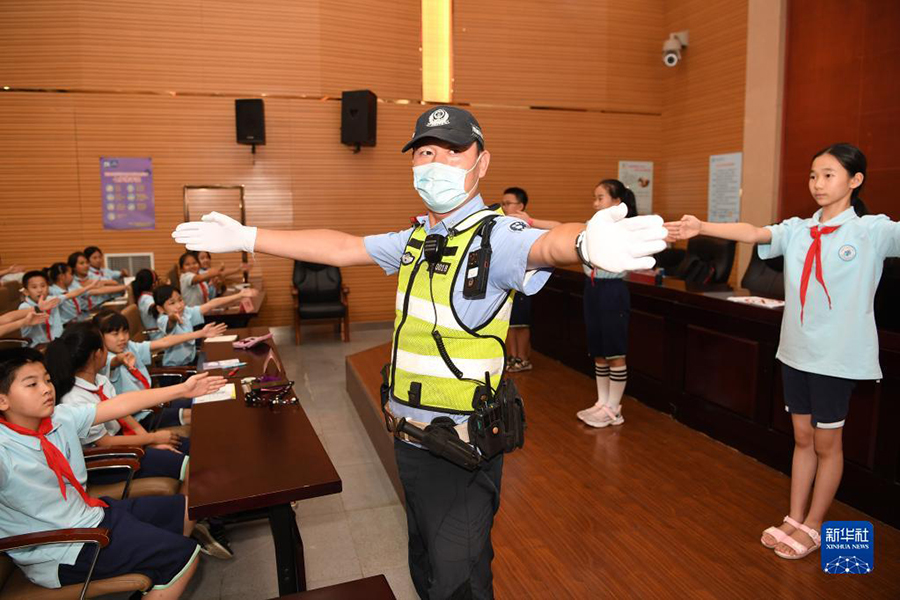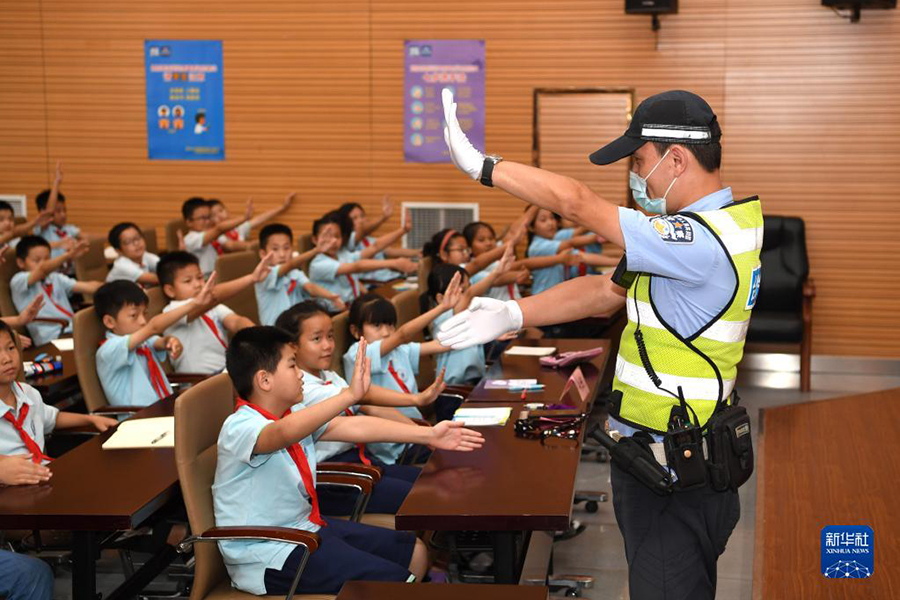 1/09月13日,合肥市公安局交警支隊包河大隊民警教學生們學習交警手勢。(新華社記者 劉軍喜/攝)