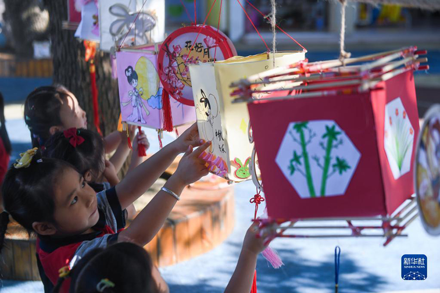 1/09月17日,孩子們?cè)谟^賞手工制作的中秋花燈。(新華社記者 徐昱/攝)