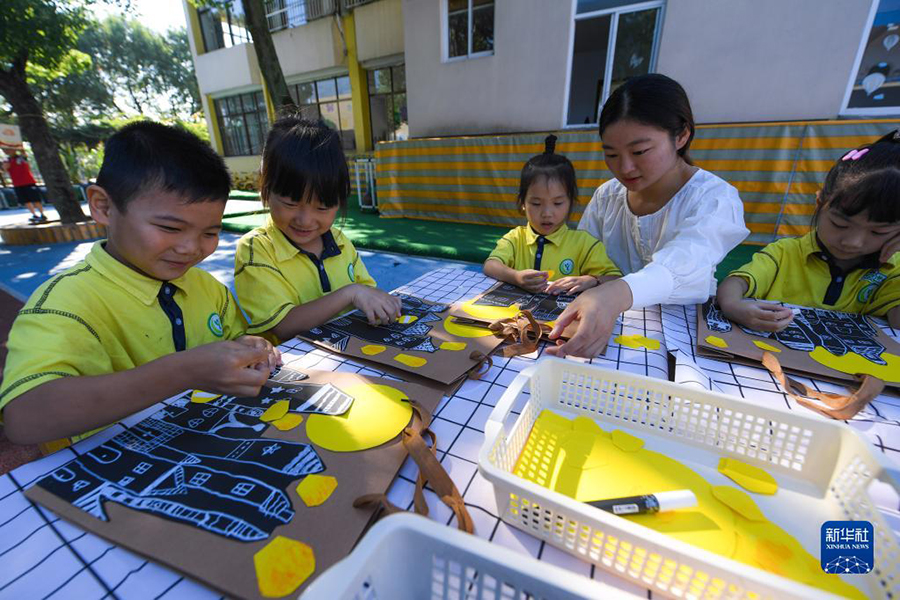 1/09月17日,孩子們?cè)诶蠋煹膸椭轮谱鳌爸星锶f(wàn)家燈火”環(huán)保紙袋。(新華社記者 徐昱/攝)