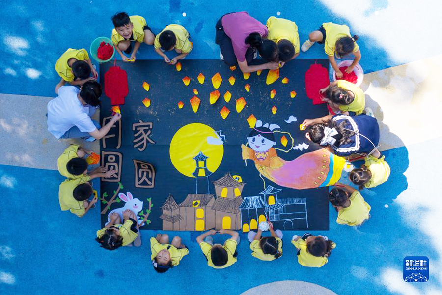 1/09月17日,孩子們和老師一起制作中秋貼紙畫“月圓家圓”(無(wú)人機(jī)照片)。(新華社記者 徐昱/攝)