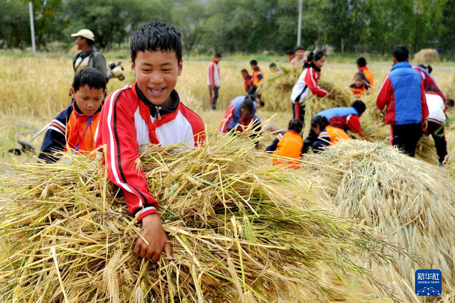 1/0日喀則市上海實(shí)驗(yàn)學(xué)校的學(xué)生們?cè)谇囡乩飫趧?dòng)(9月17日攝)。(新華社發(fā) 潘杰/攝)