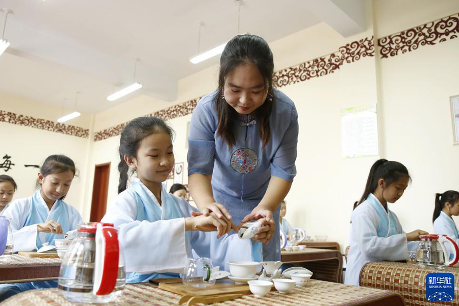 1/09月22日,邢臺市立德小學(xué)學(xué)生參加茶藝興趣晚托班。(新華社發(fā) 張馳/攝)