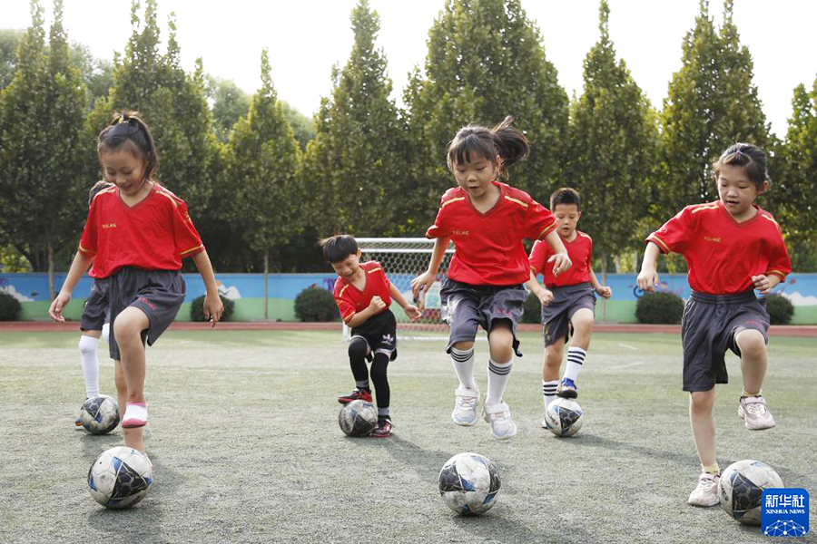 1/09月22日,邢臺市立德小學(xué)學(xué)生參加足球興趣晚托班。(新華社發(fā) 張馳/攝)