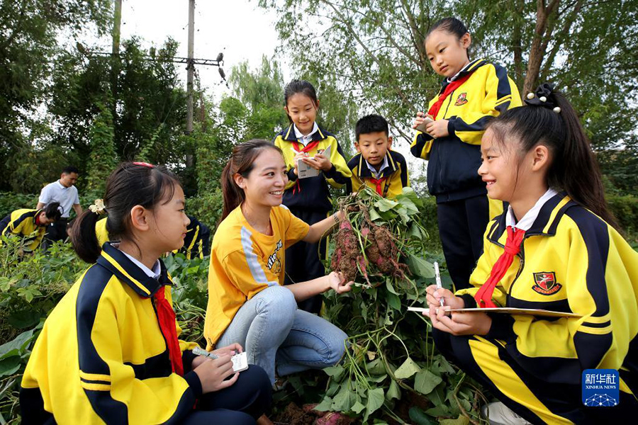 1/09月24日,在棗莊市市中區(qū)中興小學(xué)的勞動(dòng)實(shí)踐基地,老師在向?qū)W生講解地瓜的栽培知識。(新華社發(fā) 孫中喆/攝)