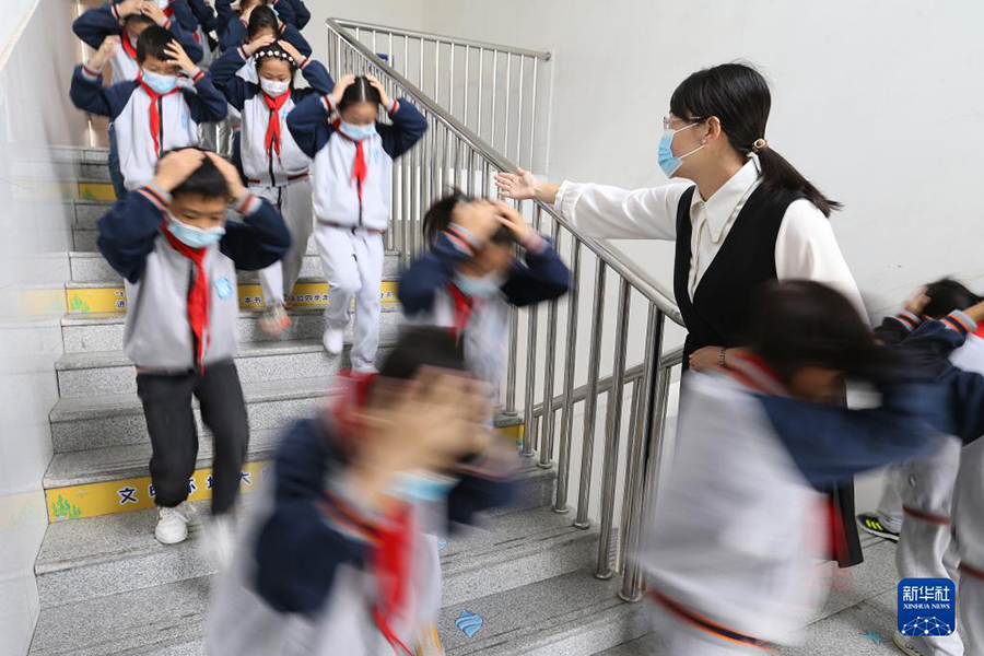 1/010月13日,江蘇省連云港市海州灣小學(xué)學(xué)生參加疏散演練。(新華社發(fā) 王健民 /攝)