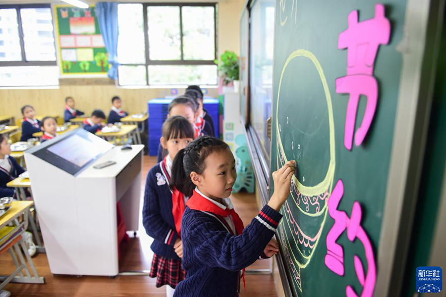 1/010月15日,在合肥市翡翠學(xué)校三年級(jí)七班,孩子們?cè)诤诎迳系摹巴搿敝挟嬒乱涣C?。(新華社記者 杜宇/攝)