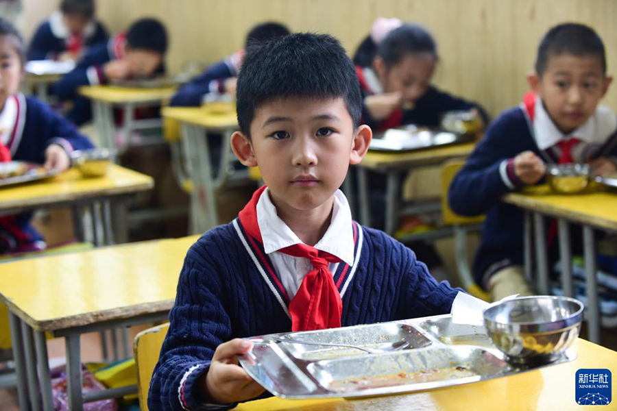 1/010月15日,在合肥市翡翠學(xué)校三年級(jí)七班,孩子們?cè)诔晕绮?。?dāng)日,安徽合肥市翡翠學(xué)校開展“踐行光盤 從小做起”世界糧食日主題活動(dòng)。老師通過引導(dǎo)孩子們?cè)趯W(xué)校的午餐中適量取餐,鼓勵(lì)孩子們做到不剩飯和菜,并讓每一位做到“光盤”的孩子在黑板上的“碗”中畫上一粒米,加深孩子們對(duì)糧食的認(rèn)知,養(yǎng)成勤儉節(jié)約、珍惜糧食的習(xí)慣。(新華社記者 杜宇/攝)