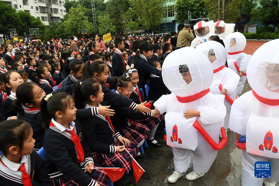 1/010月19日,在廣西河池市金城江區(qū)第三小學(xué),學(xué)生在科學(xué)節(jié)活動(dòng)現(xiàn)場(chǎng)和身穿充氣仿真太空服的同學(xué)互動(dòng)。(新華社記者 陸波岸/攝)