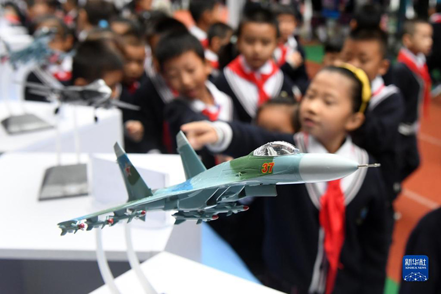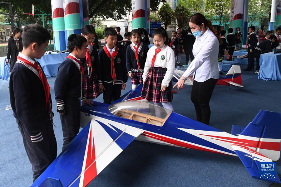 1/010月19日,在廣西河池市金城江區(qū)第三小學(xué),學(xué)生在參觀科學(xué)節(jié)活動(dòng)現(xiàn)場(chǎng)展出的飛機(jī)模型。(新華社記者 陸波岸/攝)