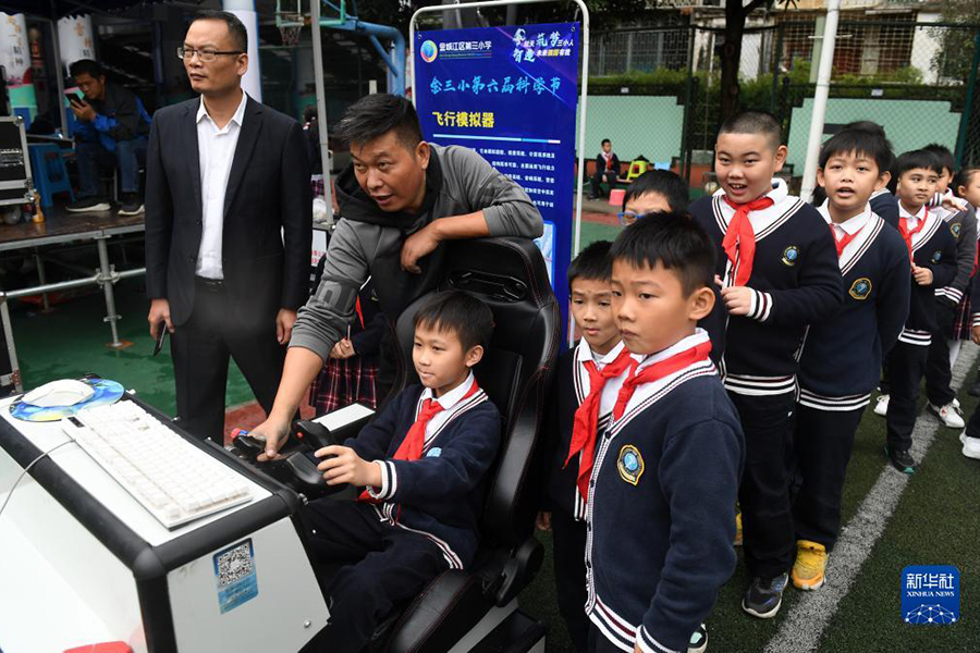 1/010月19日,在廣西河池市金城江區(qū)第三小學(xué),學(xué)生在科學(xué)節(jié)活動(dòng)現(xiàn)場(chǎng)操作飛行模擬器。(新華社記者 陸波岸/攝)