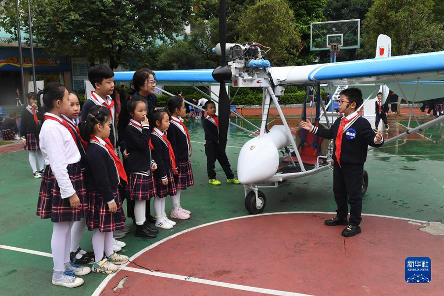 1/010月19日,在廣西河池市金城江區(qū)第三小學(xué),一名學(xué)生在科學(xué)節(jié)活動(dòng)現(xiàn)場(chǎng)講解一款飛機(jī)的結(jié)構(gòu)。(新華社記者 陸波岸/攝)