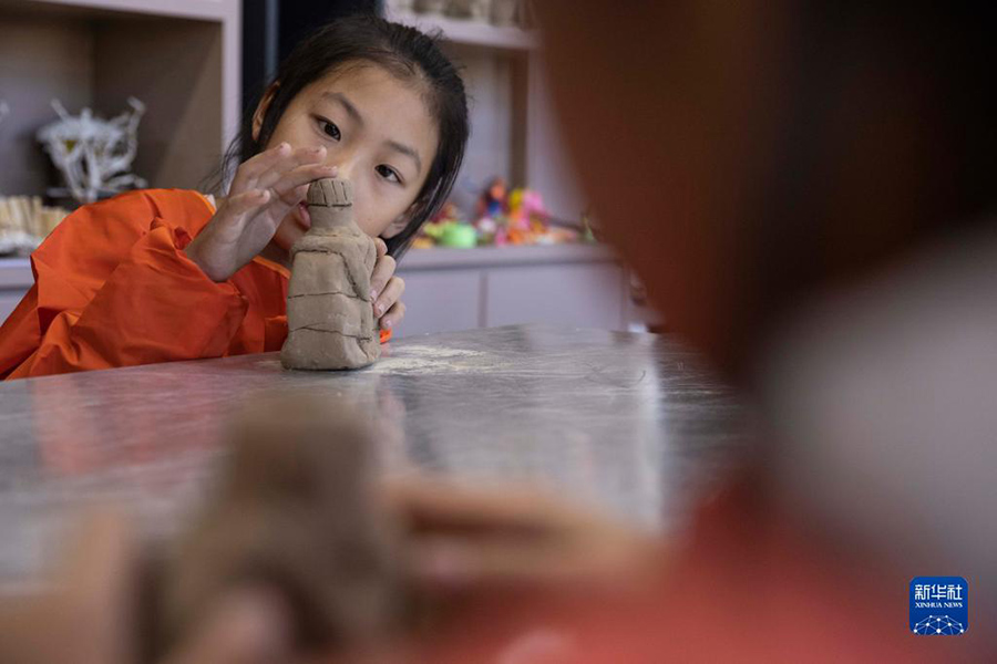 1/010月28日,學(xué)生在哈爾濱市新發(fā)中心學(xué)校建國(guó)小學(xué)鄉(xiāng)村學(xué)校少年宮學(xué)習(xí)制作泥塑。(新華社記者 張濤/攝)