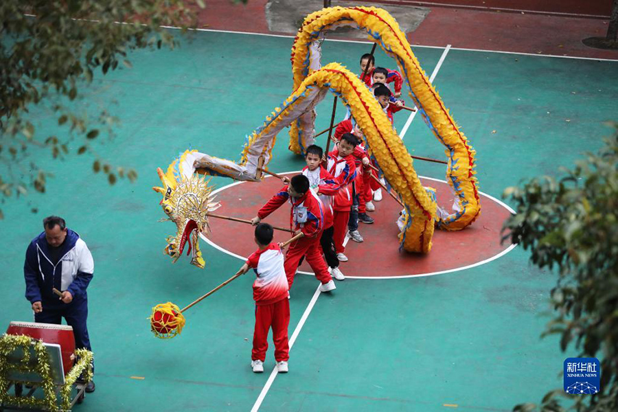 1/011月4日,貴州省錦屏縣城關(guān)第二小學學生在舞花臉龍。(新華社發(fā) 楊曉海/攝)
