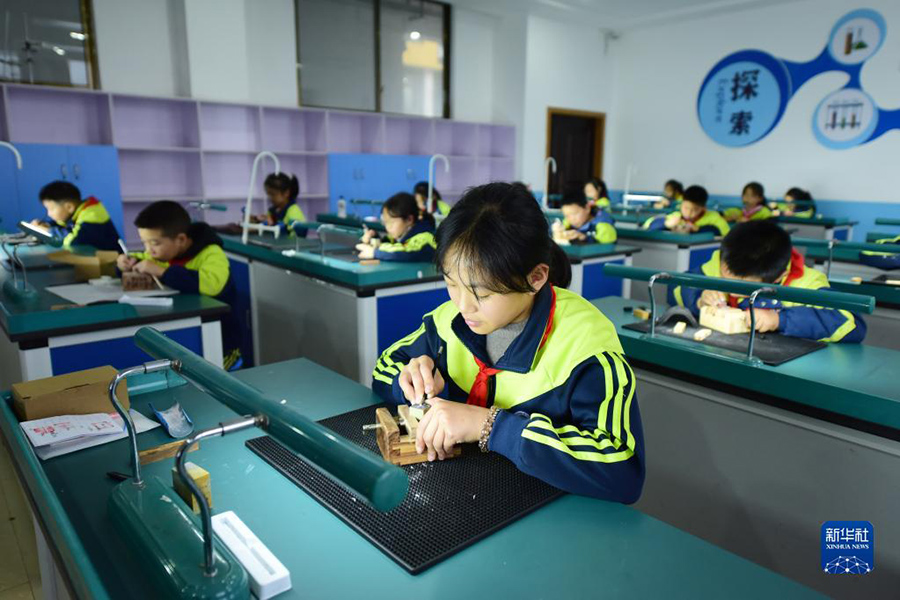 1/011月4日,貴州省黔東南苗族侗族自治州岑鞏縣第三小學學生利用課后時間練習篆刻。(新華社發(fā) 唐鵬/攝)