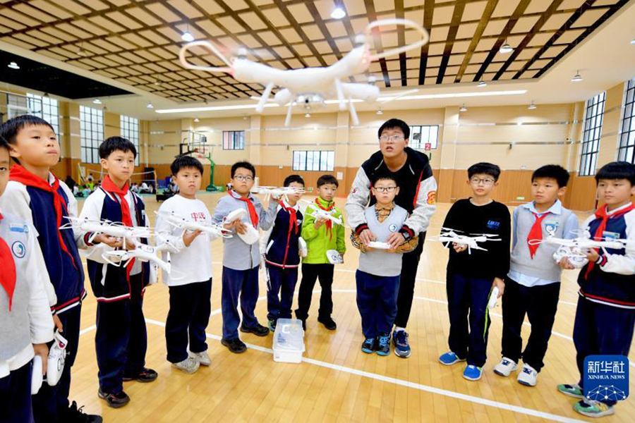 1/011月4日,浙江省臺州市路橋區(qū)南官小學學生在課后托管班學習無人機原理和飛行技術(shù)。(新華社發(fā) 王保初/攝)