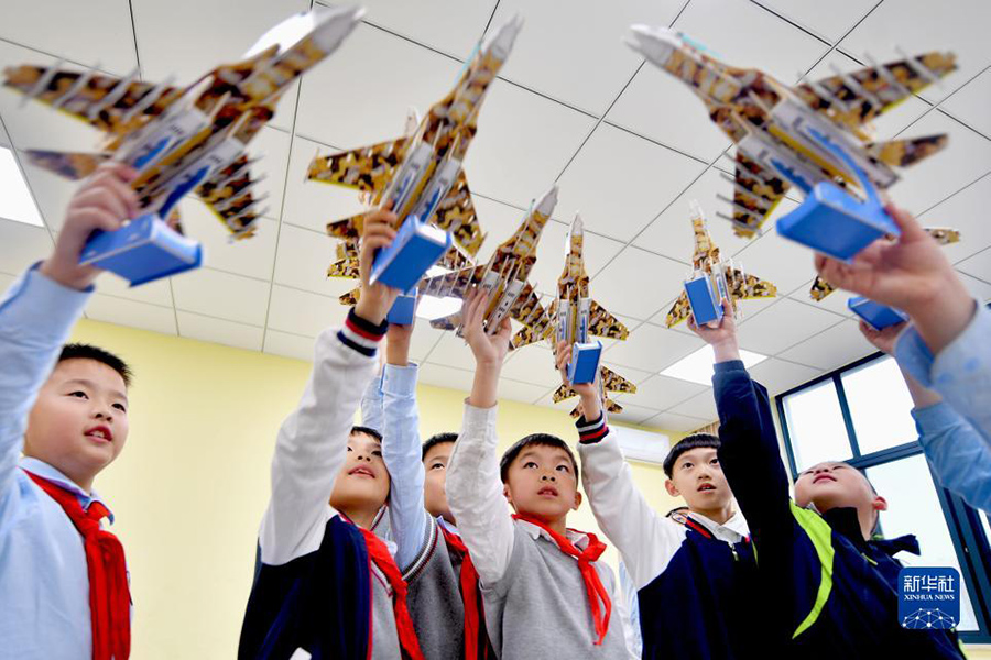 1/011月4日,浙江省臺州市路橋區(qū)南官小學學生在課后托管班展示自己制作的飛機。(新華社發(fā) 王保初/攝)