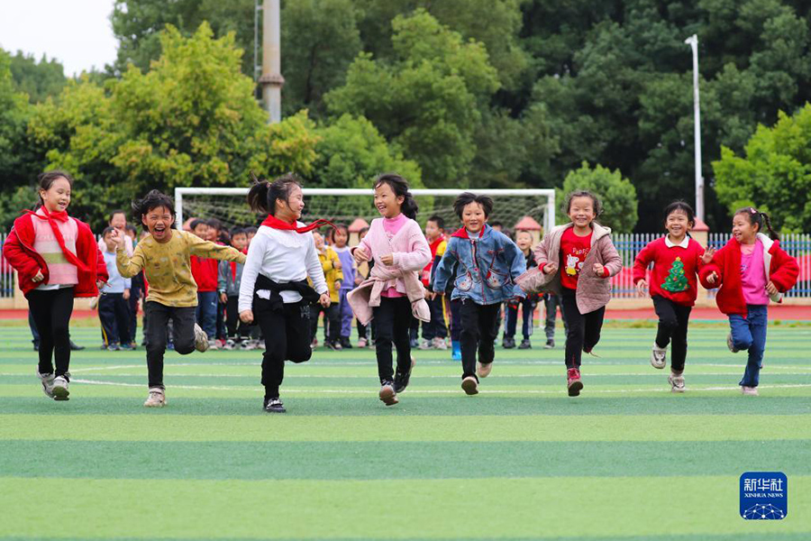 1/011月4日,在湖南省永州市新田縣雙碧小學,孩子們在運動場上做游戲。(新華社發(fā) 劉貴雄/攝)