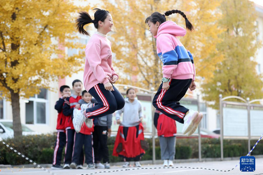 1/011月3日,山東省臨沂市沂南縣磚埠鎮(zhèn)中心小學學生在“第二課堂”上跳繩。(新華社發(fā) 杜昱葆/攝)