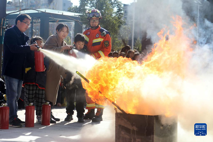 1/011月8日,在南京市雨花臺(tái)區(qū)宏圖上水幼兒園,小朋友在消防員的輔助下體驗(yàn)使用滅火器。(新華社發(fā) 蘇陽(yáng)/攝)