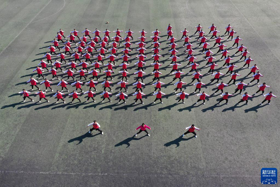 11月23日,焦作市溫縣一中學生在體育課上打太極拳(無人機照片)。(新華社發(fā) 徐宏星/攝)