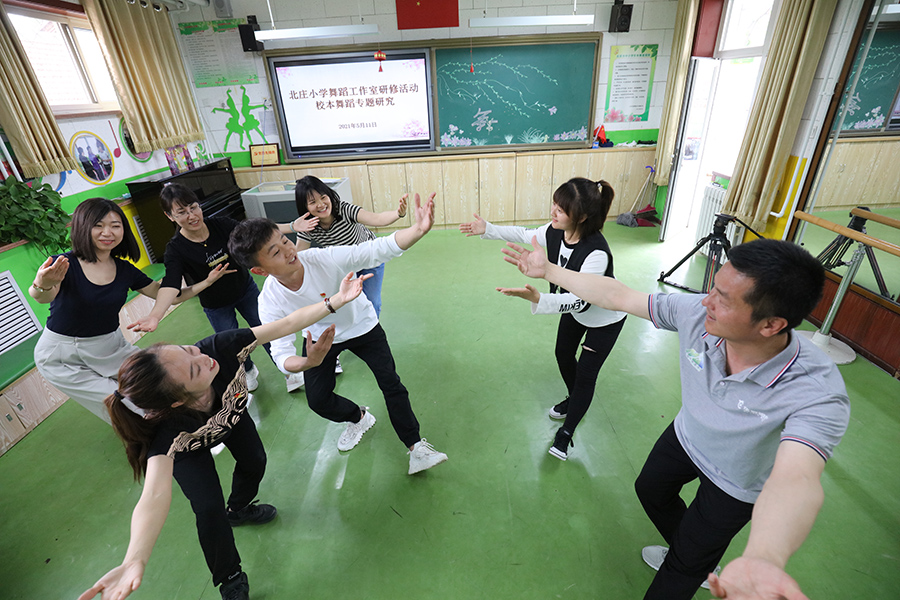 1/0為提高教師教學(xué)水平,學(xué)校為首都師范大學(xué)舞蹈專業(yè)畢業(yè)的青年教師楊賢專門建立了舞蹈工作室。這是楊賢(中)在為其他學(xué)科的教師進(jìn)行舞蹈專業(yè)培訓(xùn)。(本報(bào)記者 樊世剛/攝 通訊員 趙長順/文)