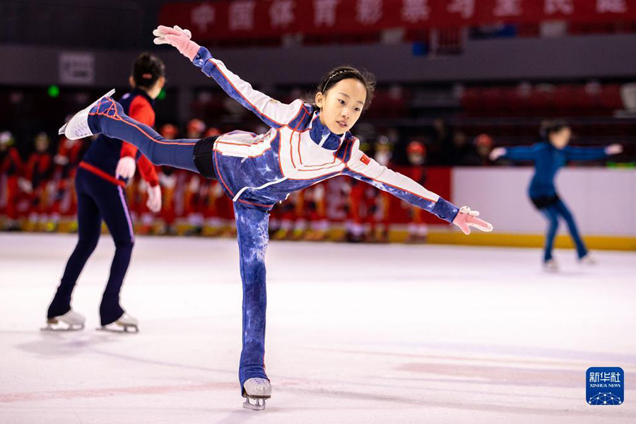 1/012月29日,在內(nèi)蒙古呼和浩特市體育中心,少年花樣滑冰隊員在表演。(新華社發(fā) 丁根厚/攝)