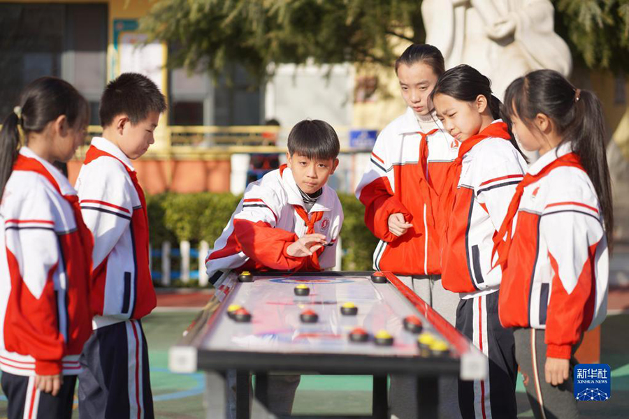 1/012月29日,河北省邢臺市內(nèi)丘縣實驗小學(xué)學(xué)生在“冰雪運動進校園”活動中練習(xí)桌面冰壺。(新華社發(fā) 劉繼東/攝)