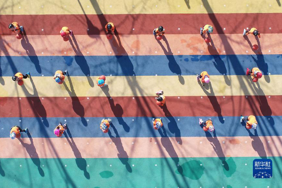1/012月29日,河北省邢臺市內(nèi)丘縣第三幼兒園小朋友們在“冰雪運動進校園”活動中練習(xí)輪滑拍球(無人機照片)。(新華社發(fā) 劉繼東/攝)