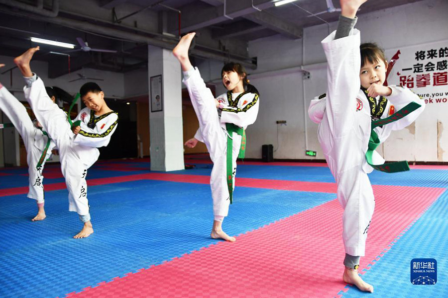1/01月18日,孩子們在湖南省永州市江永縣一家跆拳道館學(xué)習(xí)跆拳道。(新華社發(fā) 田如瑞/攝)