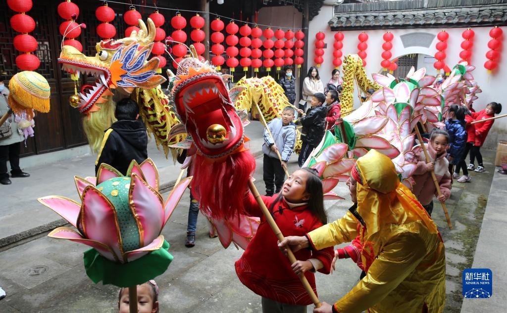 1/01月19日,在浙江省湖州市德清縣乾元鎮(zhèn)新時(shí)代文明實(shí)踐站,孩子們在學(xué)習(xí)舞龍。(新華社發(fā) 倪立芳/攝)