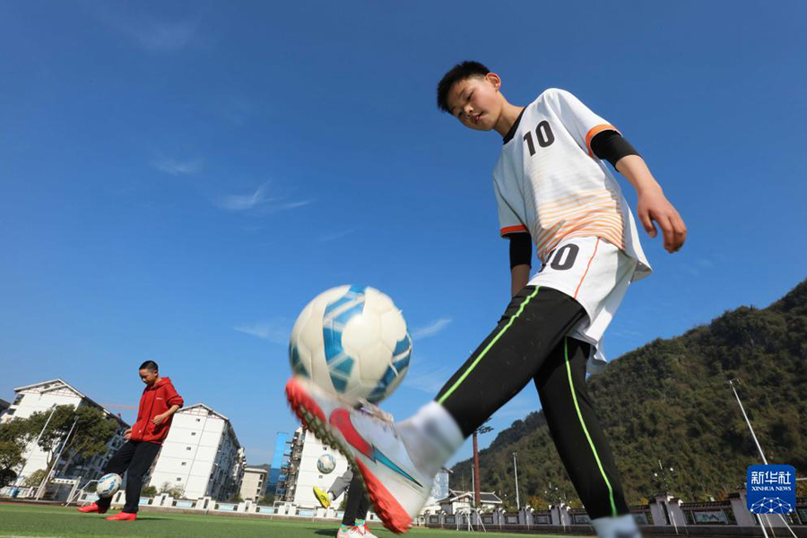 1/01月19日,湖南張家界市武陵源區(qū)的小朋友練習(xí)足球。(新華社發(fā) 吳勇兵/攝)