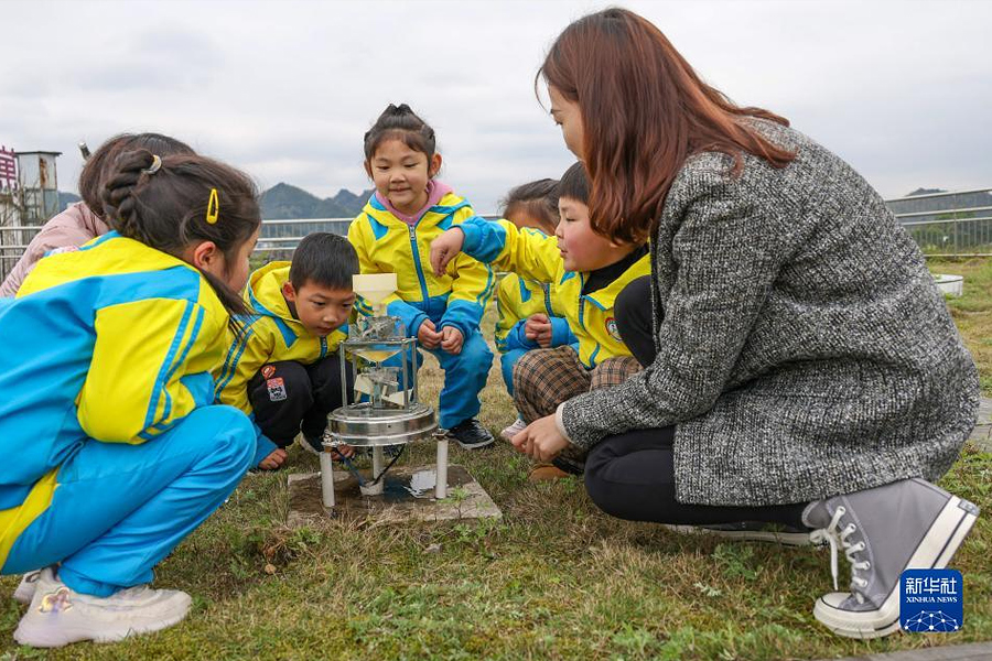 1/03月22日,在浙江省湖州市長(zhǎng)興縣開(kāi)發(fā)區(qū)實(shí)驗(yàn)幼兒園,孩子們?cè)跉庀罂破罩驹刚咧笇?dǎo)下通過(guò)雨量筒觀測(cè)降水量。(新華社發(fā) 譚云俸/攝)