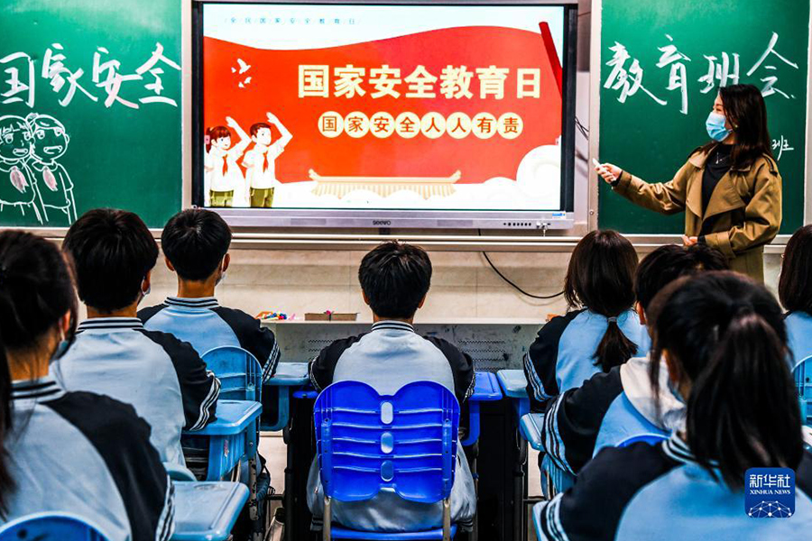 1/04月14日,在湖南省衡陽市常寧市尚宇學校,老師向?qū)W生講解國家安全知識。(新華社發(fā) 周秀魚春/攝)