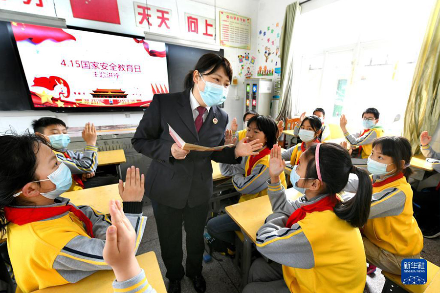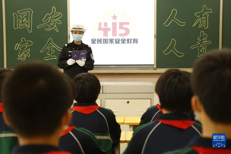 1/04月14日,南京市公安局建鄴分局沙洲派出所民警在轄區(qū)內(nèi)一所小學為同學們進行國家安全教育宣傳活動。在第七個“全民國家安全教育日”即將來臨之際,各地開展形式多樣的主題宣傳教育活動,提高人們的國家安全意識。(新華社記者 李博/攝)