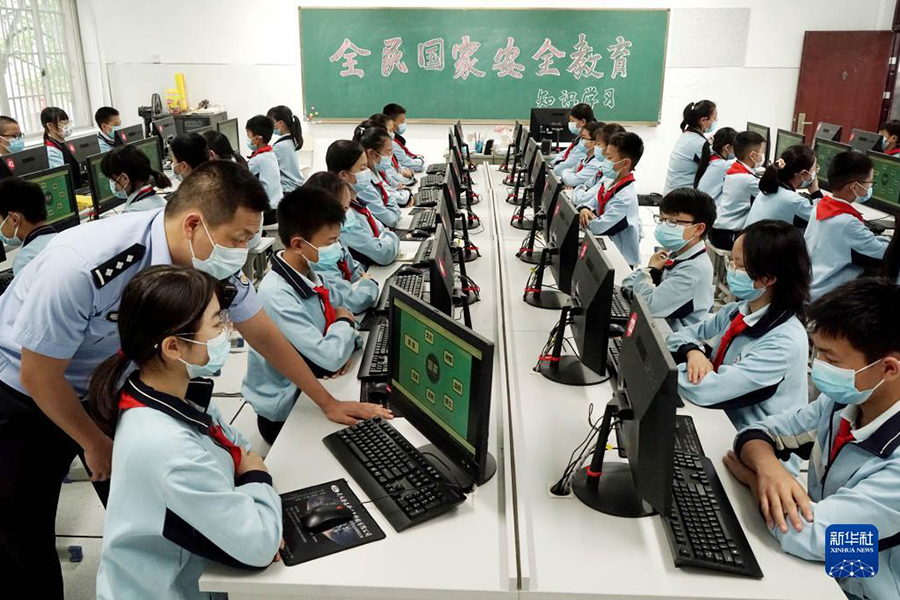 1/04月14日,公安民警在浙江省金華市武義縣三角店小學多媒體機房指導學生進行國家安全教育答題。(新華社發(fā) 張建成/攝)