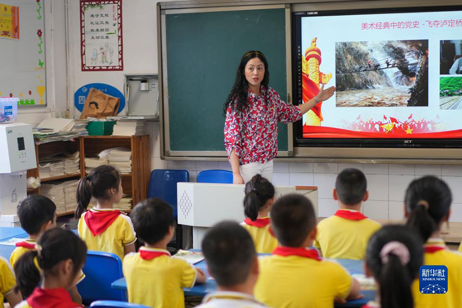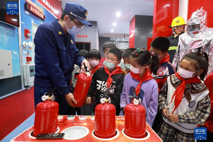1/05月11日,在河北省石家莊市行唐縣消防救援大隊(duì)科普教育館,消防隊(duì)員在指導(dǎo)學(xué)生們使用滅火器。(新華社發(fā) 梁子棟/攝)
