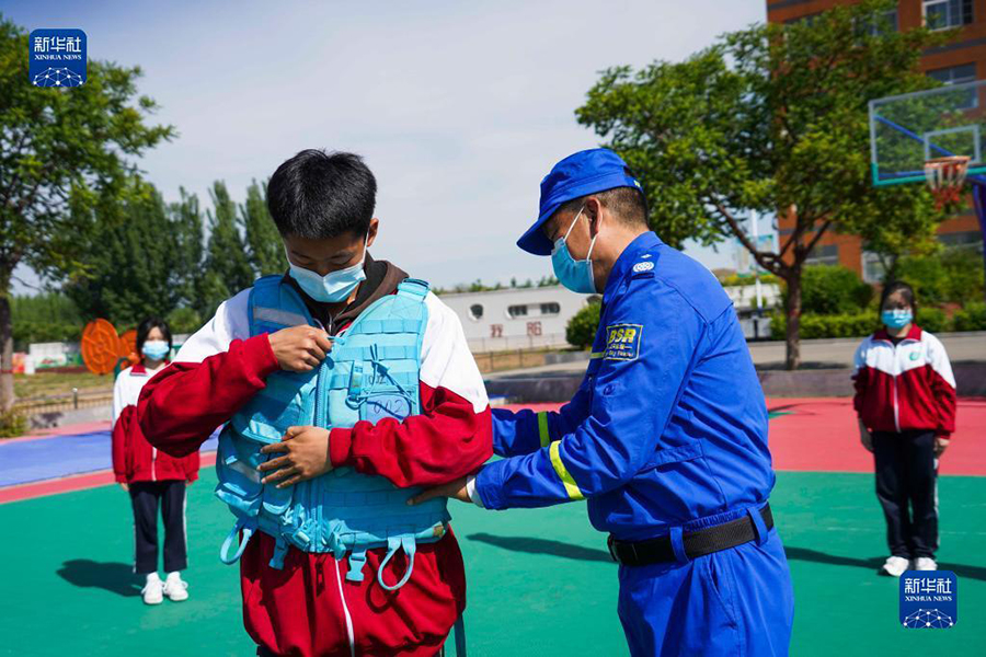 1/05月11日,河北省遵化市崔家莊鎮(zhèn)中學(xué)的學(xué)生在學(xué)習(xí)救生衣穿法。(新華社發(fā) 劉滿倉(cāng)/攝)