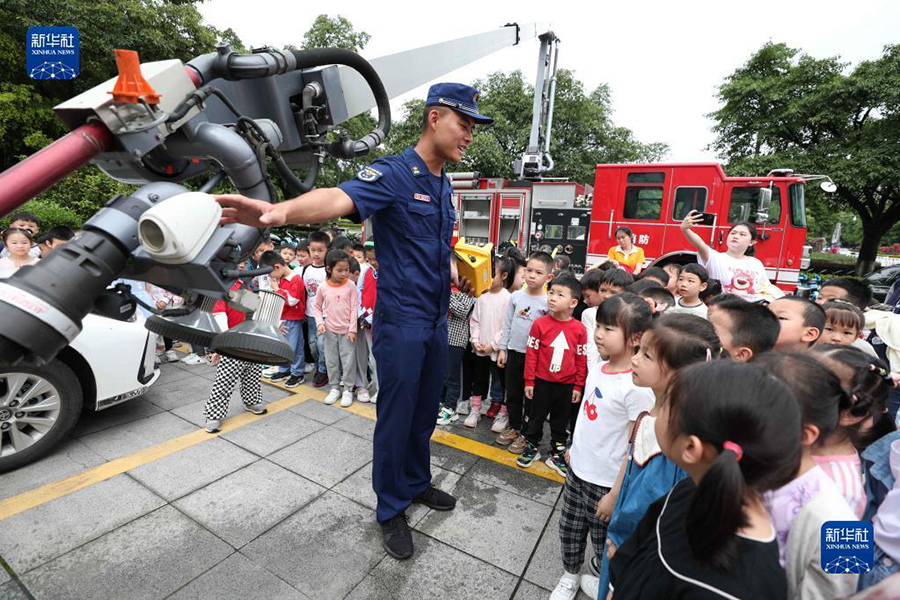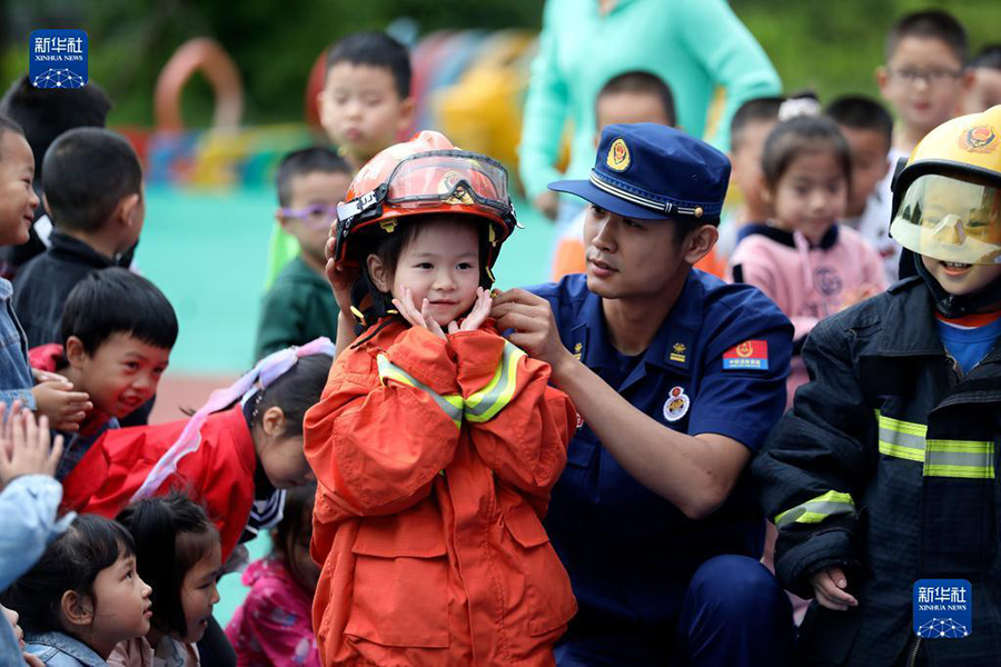 1/05月11日,在湖南省資興市鯉魚江幼兒園,消防員指導(dǎo)小朋友們?cè)嚧岆U(xiǎn)救援服。(新華社發(fā) 李科/攝)