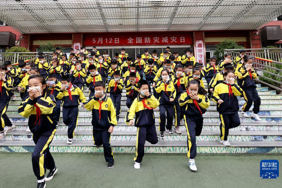 1/05月11日,山東省棗莊市文化路小學(xué)學(xué)生在進(jìn)行火災(zāi)應(yīng)急疏散演練。(新華社發(fā) 孫中喆/攝)
