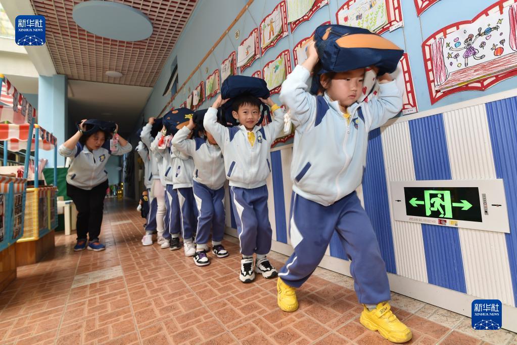 1/05月11日,在江蘇南京建鄴區(qū)一幼兒園,小朋友在老師的引導(dǎo)下進(jìn)行應(yīng)急疏散演練。(新華社發(fā) 方東旭/攝)