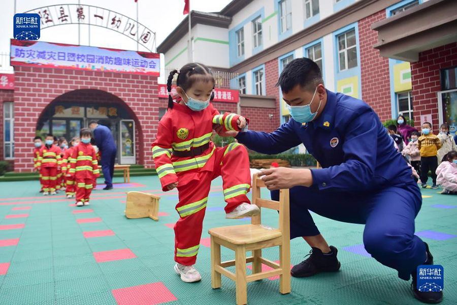 1/05月11日, 在河北省石家莊市井陘縣第一幼兒園,小朋友參加趣味消防救援障礙接力活動(dòng)。(新華社發(fā) 張曉峰/攝)