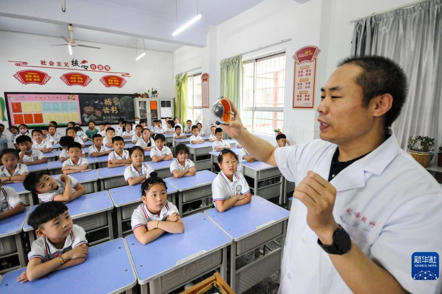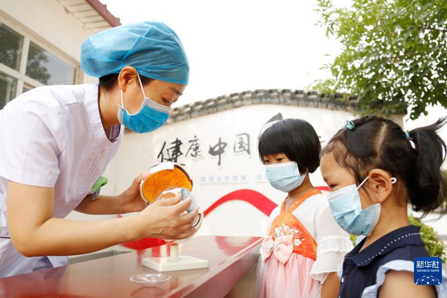 1/06月5日,河北省邢臺市南和區(qū)人民醫(yī)院醫(yī)務人員深入鄉(xiāng)村開展基層義診活動,為賈宋鎮(zhèn)蘇史張村小朋友講解眼睛的結構和功能。(新華社發(fā) 張馳/攝)