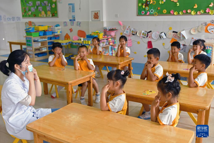 1/06月5日,在山東省煙臺市福山區(qū)一家幼兒園,醫(yī)務人員指導小朋友做眼保健操。(新華社發(fā) 孫文潭/攝)