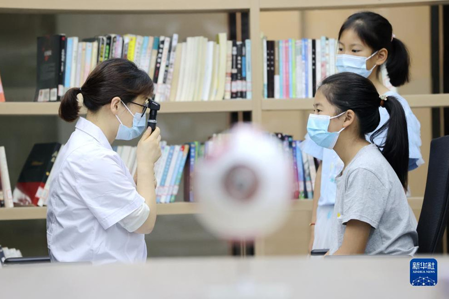1/06月5日,在浙江省湖州市德清縣武康街道新豐未來社區(qū),醫(yī)務人員為社區(qū)兒童檢查視力。(新華社發(fā) 謝尚國/攝)