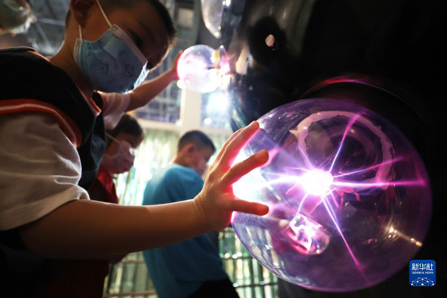 1/08月14日,在中國科學(xué)技術(shù)館,學(xué)生在參觀名為“光伏板的進(jìn)化”裝置。(新華社記者 鞠煥宗/攝)
